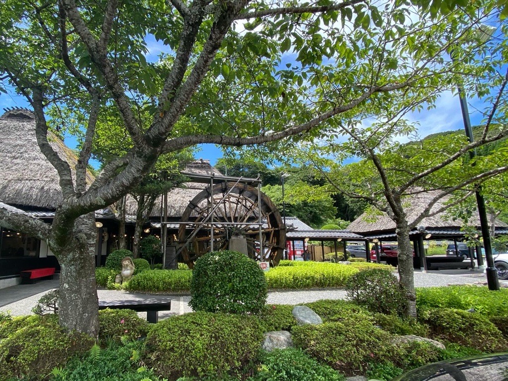 緑に囲まれた場所に建つ、茅葺き屋根と水車が目印の趣ある店構え。店内へ足を踏み入れると、飴色に艶を帯びた梁が美しく、大きな囲炉裏や全国各地の民具が迎えてくれます。まるで“田舎のおばあちゃんの家”に遊びに来たような、ほっとする空間。