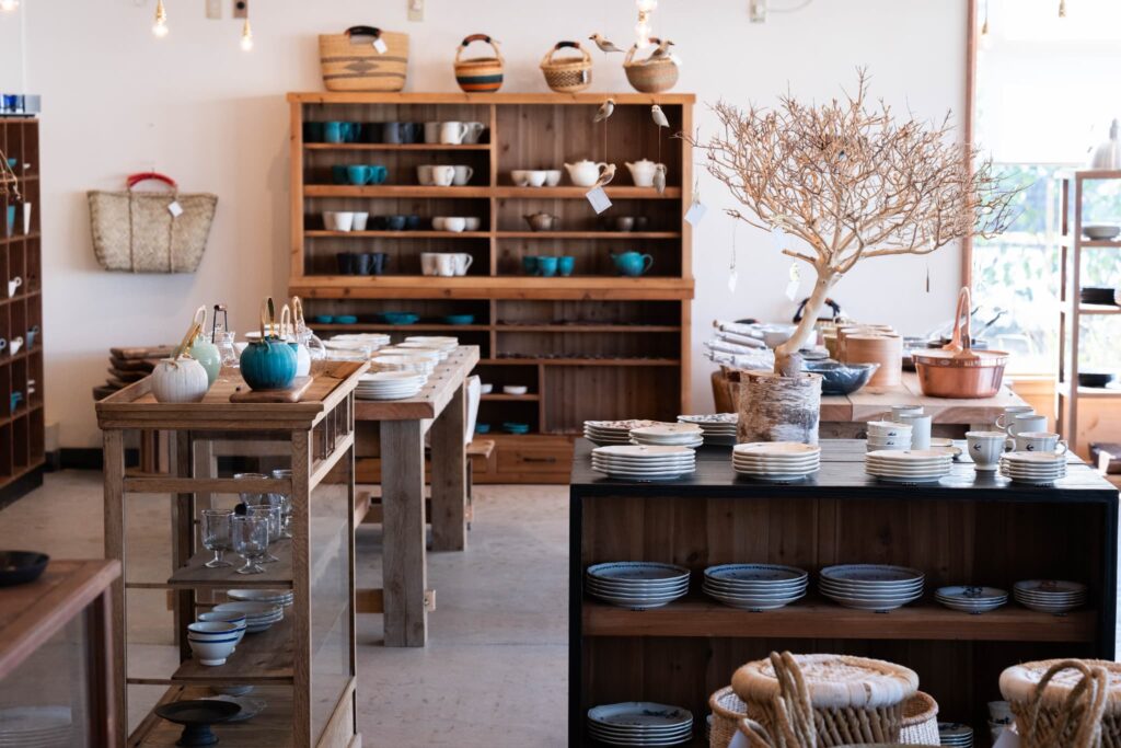やさしい音楽が流れる店内にある器や雑貨を、一つひとつをじっくり見てまわりたくなる…気がつけば時間を忘れて長居してしまうほど。