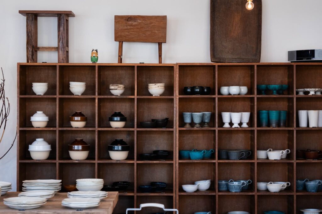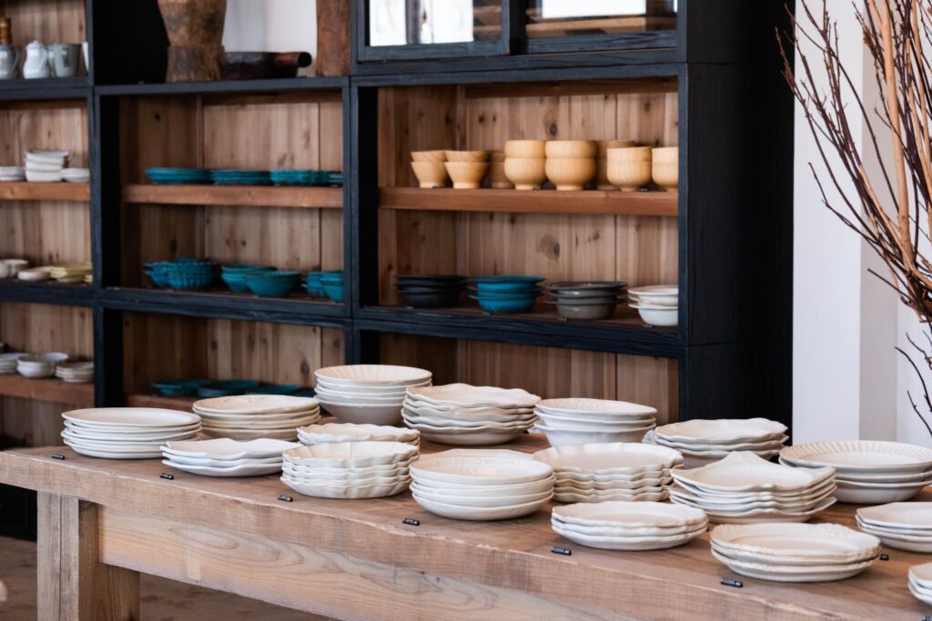 大きな窓から光が差し込む店内には、益子焼を中心とした窯元の器がうつくしくディスプレイされています。深みのあるシャビーターコイズの器や、落ち着いた白い器、丸みのあるもの、角皿、小鉢、大皿…。それぞれの個性と手仕事ならではの味わいがあり、眺めているだけで心がなごむものばかり。