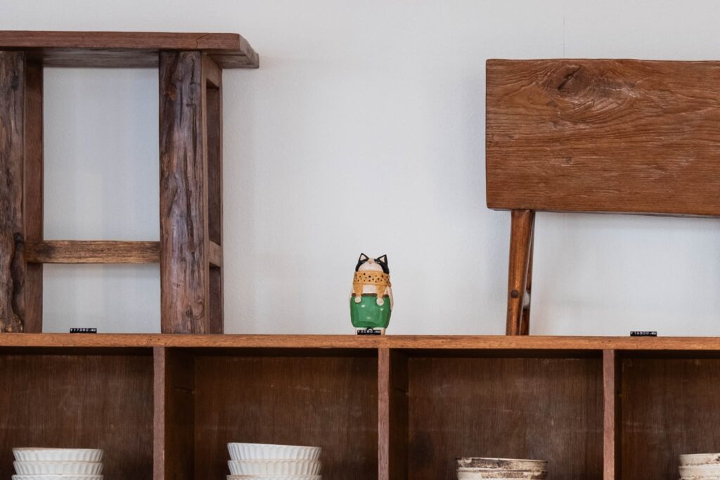 「福山フクノバ」では、商品を並べる棚やテーブルなど、什器そのものを購入することもできます。現行品、ヴィンテージ、手づくりのものが混在しており、それが独特の心地よさを生みだしています。元はケーキや菓子のショーケースだったというガラス棚は、天板が浅いトレーのようなデザインで、どこか遊び心を感じます。水に浸かった木材を再利用してつくられたテーブルには、時間の流れを感じさせる風合いがあり、置かれているだけで空間に深みを与えています。