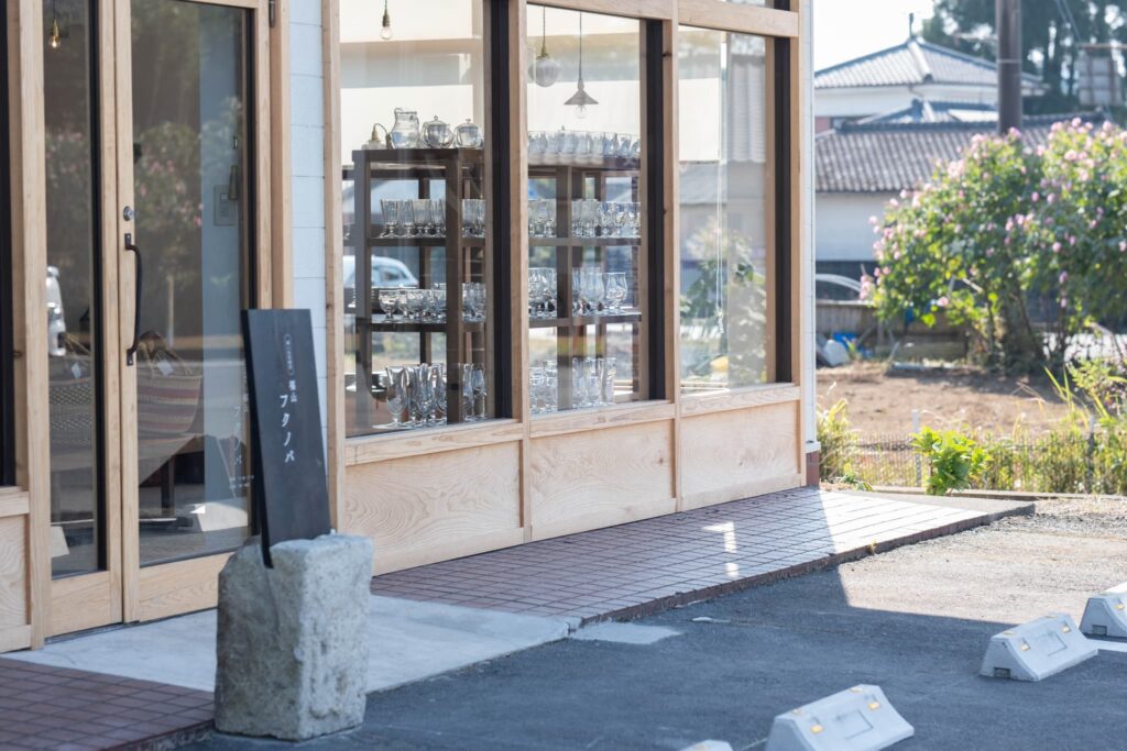 国分駅から車で約30分。霧島市福山町にある器と生活雑貨「福山フクノバ」は、白の外壁に、木枠の窓とドアが印象的なお店。