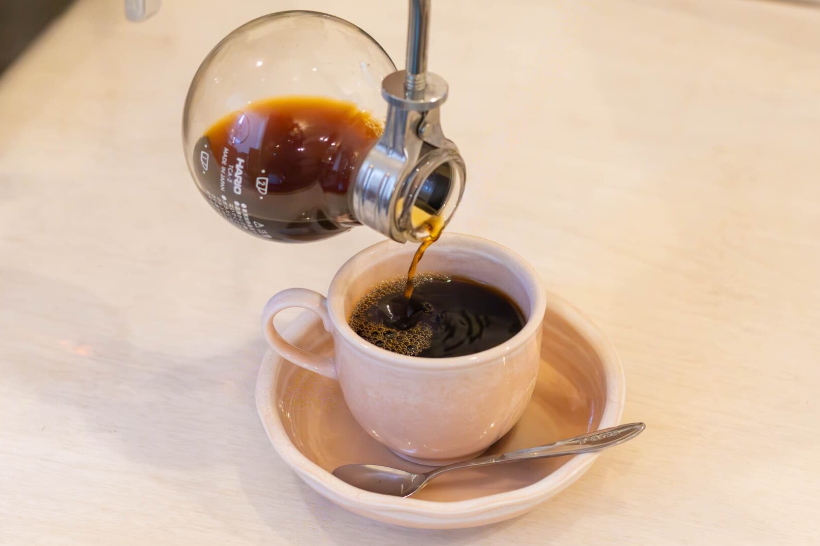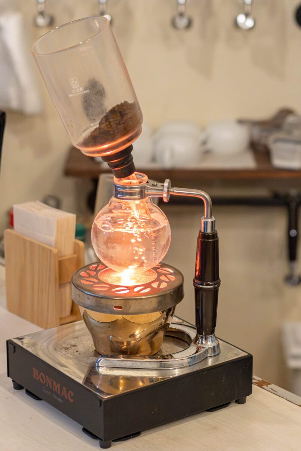 コーヒー豆は注文ごとに挽いており、オーダー後には店内に豊かな香りが漂います。カウンター席では、コポコポと沸き上がるサイフォンのフラスコを眺めることも楽しみの一つ。