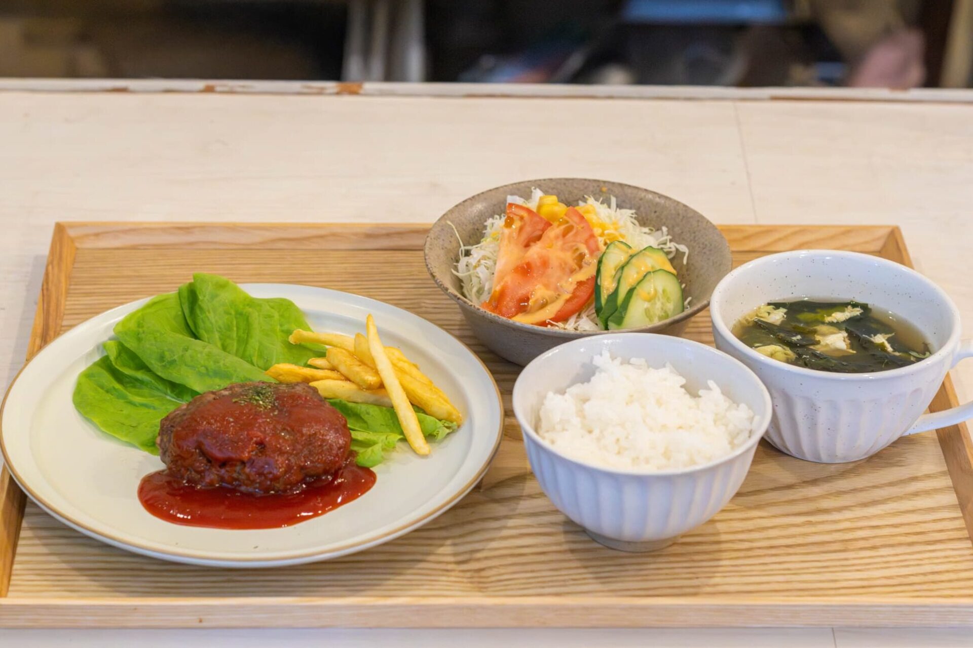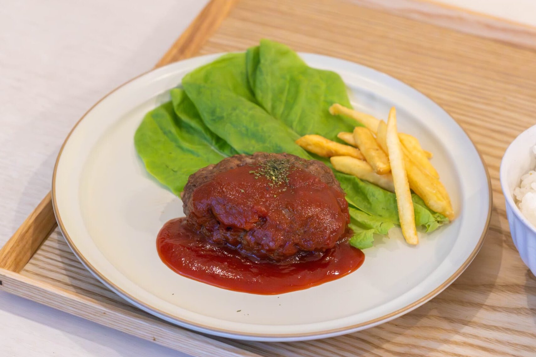 人気No.1は「ハンバーグランチ」。国産の合い挽きミンチを使い、ふっくらと焼き上げたハンバーグは、ひとくちごとに肉の旨みが伝わるおいしさ。ケチャップとウスターソースを合わせたオリジナルソースは、甘みと酸味のバランスが絶妙で、添えられたポテトに絡めてもおいしく味わえます。