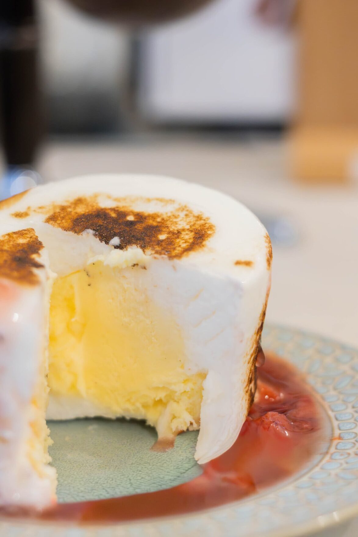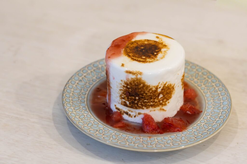 食後におすすめのスイーツは、同店オリジナルの「スモア」。高さ約10センチの手作りマシュマロの中に、バニラアイスがたっぷりと詰まった、インパクト抜群のスイーツです。ふわふわのマシュマロと冷たいアイスの食感、濃厚なバニラアイスとストロベリーソースの軽やかな酸味が絶妙に調和しています。