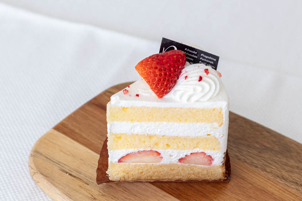 ショーケースには、同店ならではのケーキをはじめ、季節の果物を使ったショートケーキやタルトが。秋には、シャインマスカットやサツマイモ、ユニークな名前のアップルパイ「あっぷるぷるぷるぷるっぷる」などがショーケースを彩り、冬から春にかけては、志布志の「農Lifeいちごの村」のイチゴを使ったケーキが並びます。