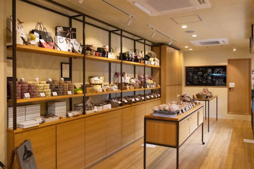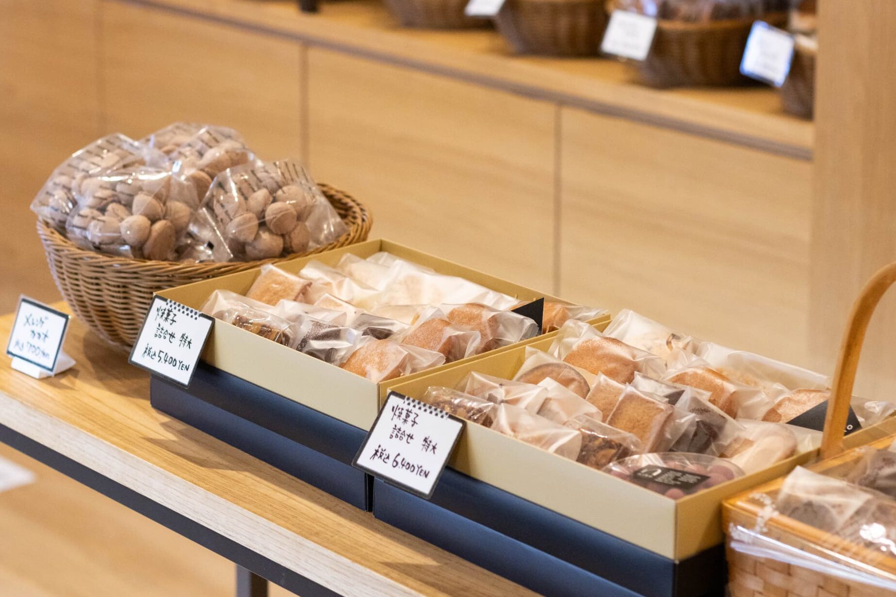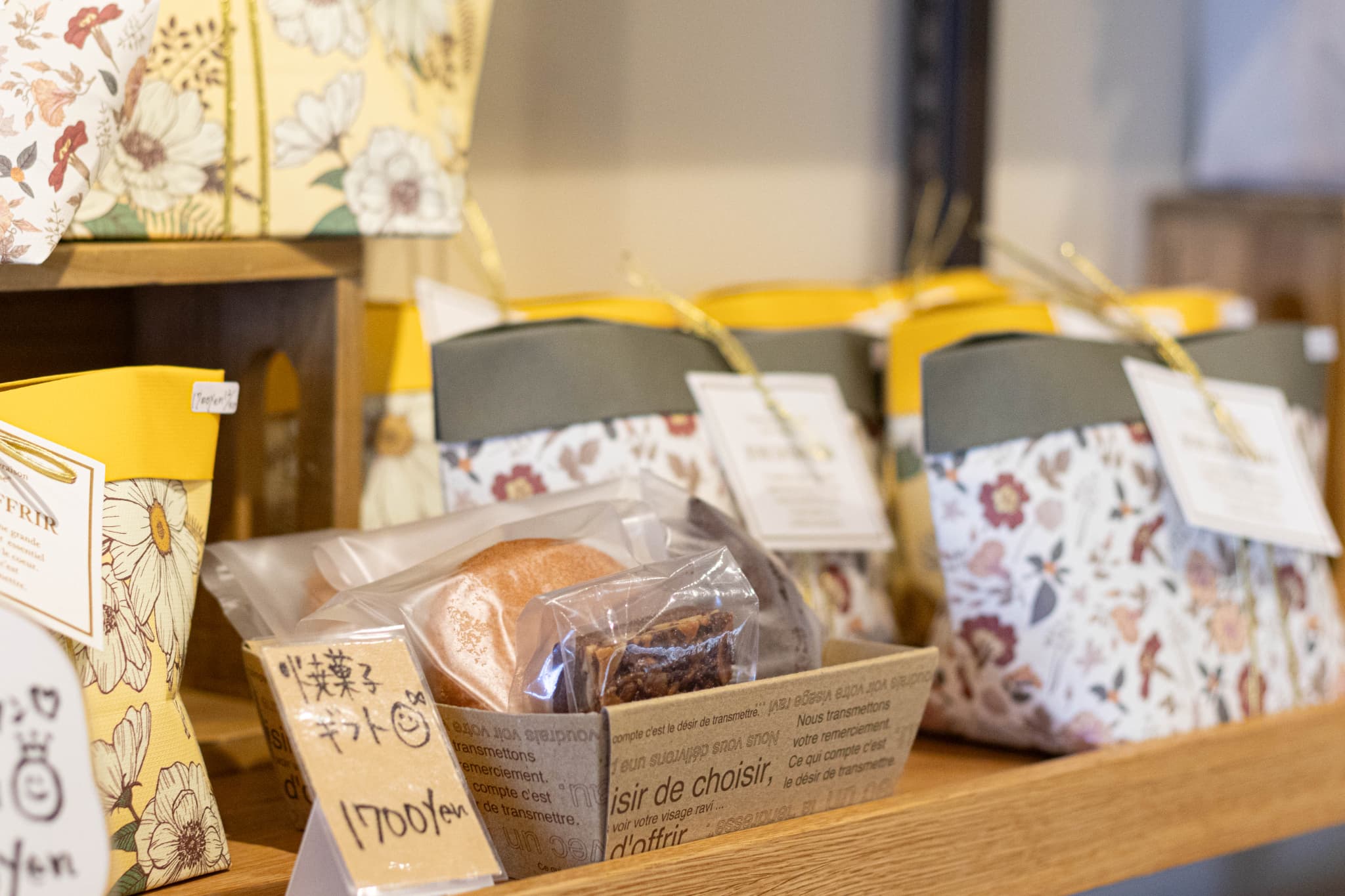 焼き菓子や、チョコレートを使ったお菓子のコーナーもあり、店内中央にはパティシエが焼き上げたパンや、焼き菓子のギフトボックスが並びます。予算や個数に合わせた詰め合わせセットも作ってもらえるので、スタッフに気軽に相談してみてください。