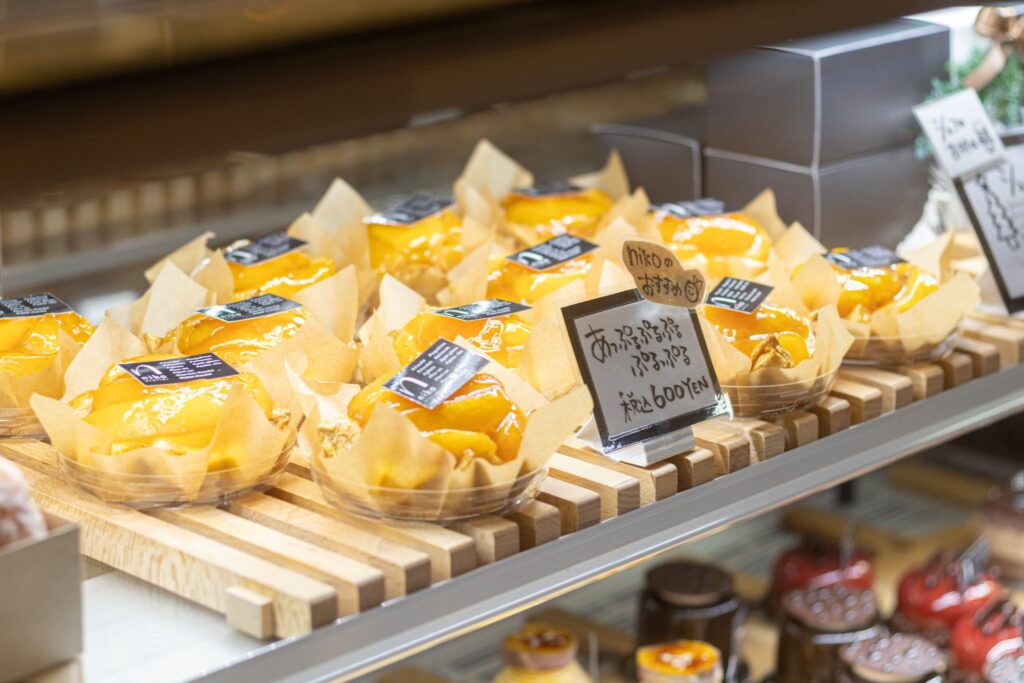 ショーケースには、同店ならではのケーキをはじめ、季節の果物を使ったショートケーキやタルトが並びます。このときは、シャインマスカットやサツマイモ、和栗を使ったケーキ、ユニークな名前のアップルパイ「あっぷるぷるぷるぷるっぷる」などがショーケースを彩っていました。冬から春にかけては、志布志の「農Lifeいちごの村」のイチゴを使ったケーキが登場します。