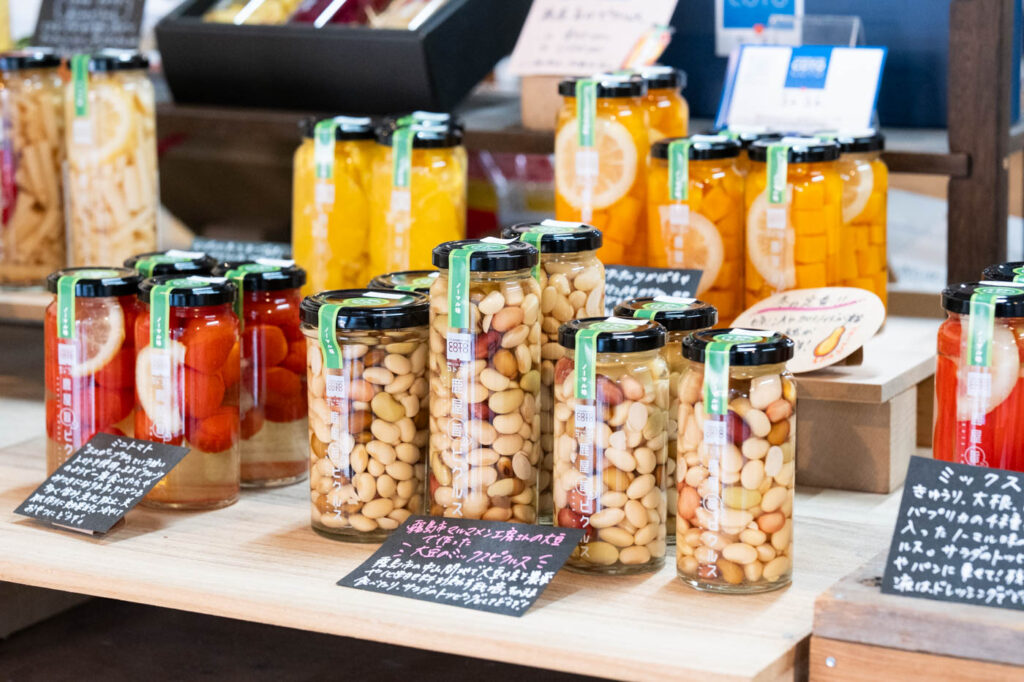 COTOCOTOの手づくりピクルス「鹿屋旨か!ピクルス」は、「野菜を食べよう、もっと美味しく食べよう」をコンセプトにご夫婦で作られている人気商品です。使う野菜は主に地元産。このときは、霧島市の中山間地で農薬や化学肥料を使わずに育てられたマルマメン工房の大豆を使った「大豆のミックスピクルス」や、自家農園で育てたバターナッツかぼちゃによる「バターナッツかぼちゃのピクルス」など、素材のおいしさを生かした商品が並んでいました。
