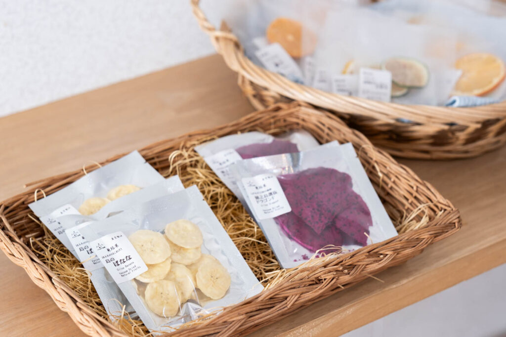 このとき並んでいたのは、まだ他ではほとんど手に入らないという、株式会社P&Y’s Laboの「ドライフルーツ」。真空製法でじっくり水分を抜き、果実本来の味わいをぎゅっと凝縮しています。なかでも徳之島町産バナナを使ったドライフルーツは、袋を開けた瞬間に広がる甘い香りと、サクッと軽い食感が魅力。バナナだけとは思えないほど蜜のように濃厚な甘さで、バナナのクリーミーな風味が楽しめます。