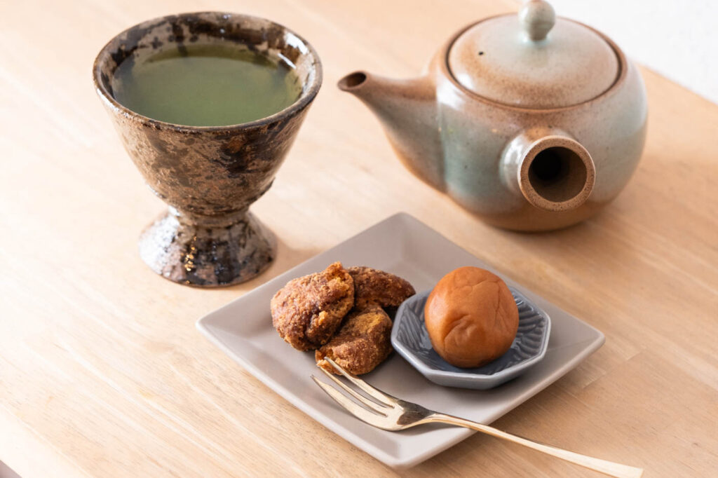 お茶のお供は、大正15年創業の老舗・原製菓舗の「ひとくちげたんは」を。さらに、無除草剤で育てた完熟南高梅を使う堀之内農園の「鹿屋南高梅」も添えられ、鹿屋らしさがぎゅっと詰まったセットになっています。一煎目はやや低めの湯温で入れるため、二煎目まで楽しめるよう急須で提供されるのも嬉しいポイントです。