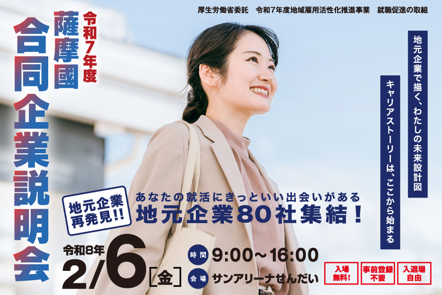 令和8年2月6日(木)、薩摩川内市の「サンアリーナせんだい」にて、薩摩國合同企業説明会が開催されます。薩摩川内市・阿久根市・いちき串木野市・さつま町・出水地域の企業約80社(予定)が一堂に集結し、就職・転職希望者に向けて魅力ある企業情報を発信します。
