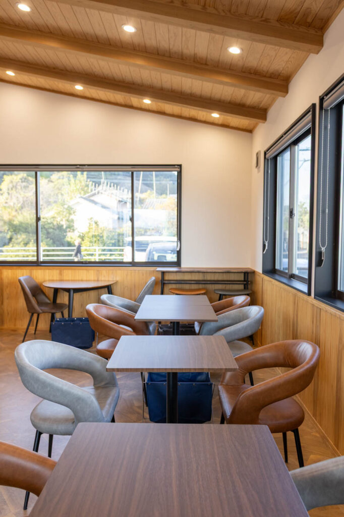 スギの香りに包まれた店内は、思わず深呼吸したくなる心地よさ。大きな窓から桜島が見えるときもあり、ゆったりとした時間が流れます。