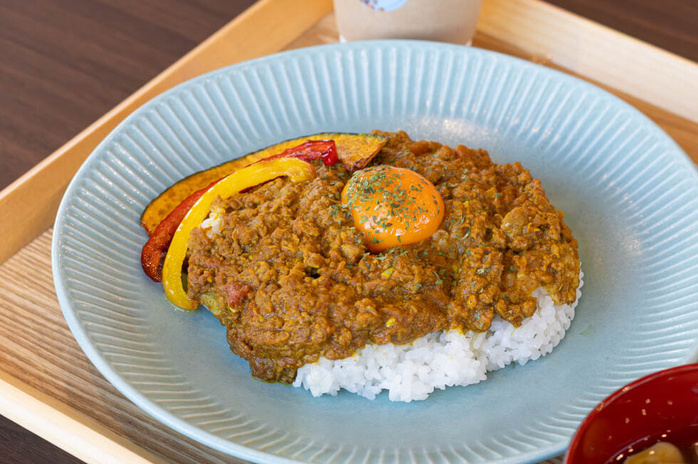 このときは、旬の揚げ野菜が彩りを添えたキーマカレーでした。6種類のスパイスをブレンドしたルーは、チリペッパーの辛さが程よく効き、トマトペーストのコクとあらびきミンチの旨みがしっかり感じられます。トッピングの卵黄を絡めると、そこにまろやかさが加わります。