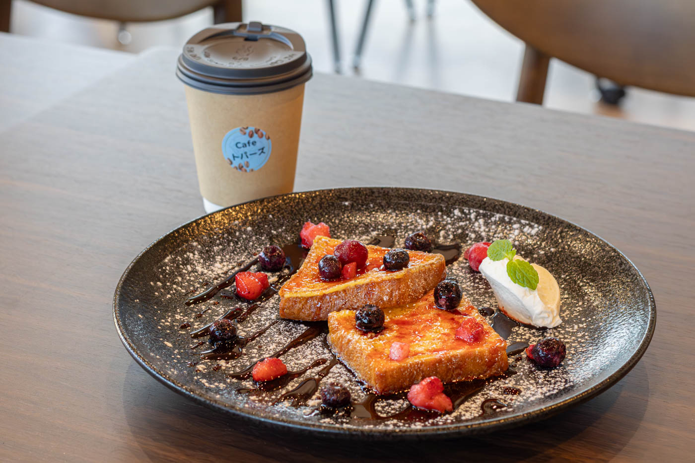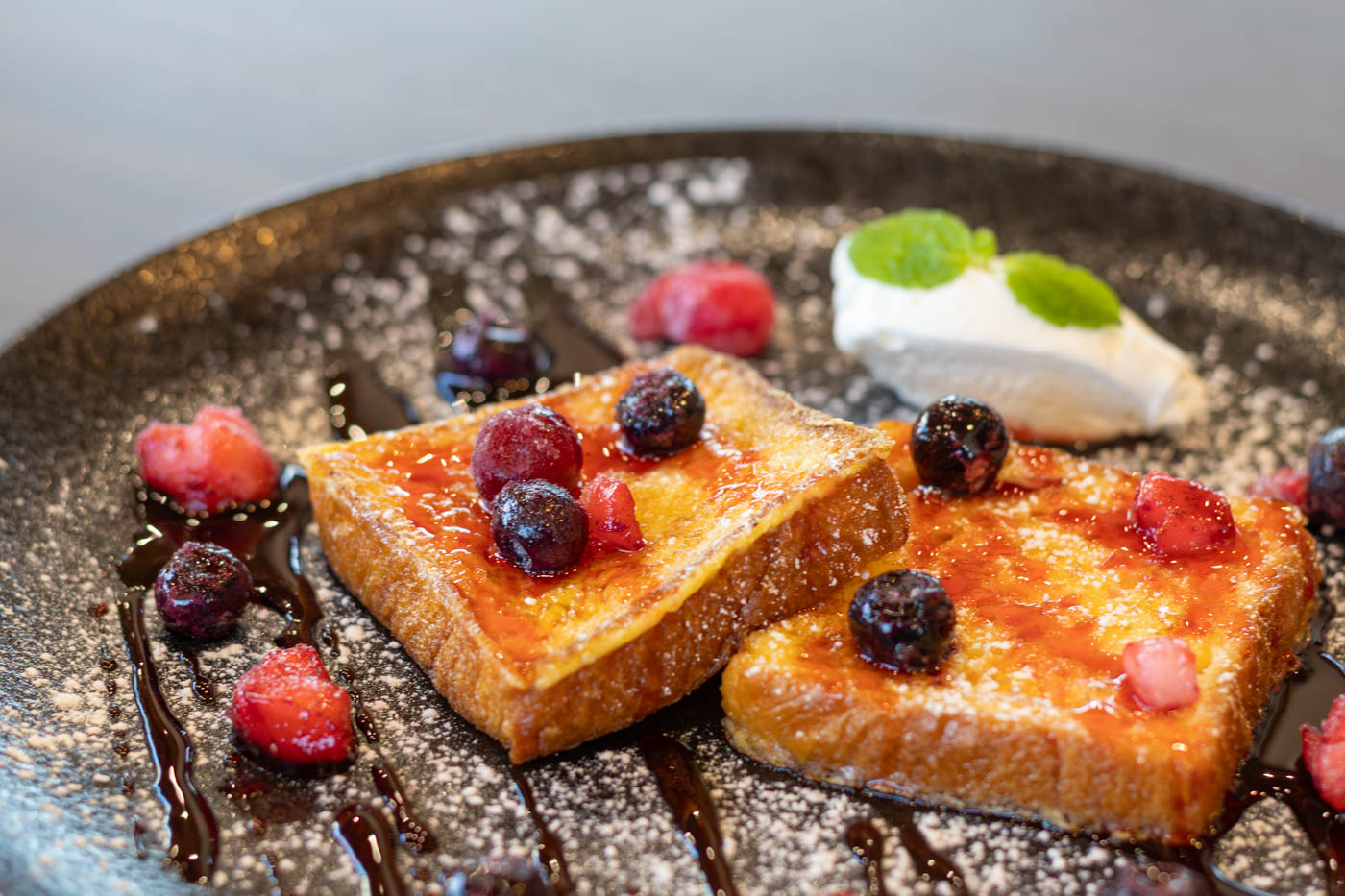 今回紹介するのは、「フルーツフレンチ」。甘さ控えめの卵液をデニッシュにしっかり染み込ませ、鉄板でふんわりと焼き上げたフレンチトーストには、フローズンベリーと選べるソース(ストロベリー・チョコレート)がかかっています。運ばれてきた瞬間にバターとバニラの香りがふわっと広がり、幸せな気分に。