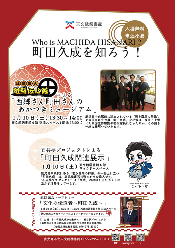 2026年1月10日(土)13:30~15:00、センテラス天文館4階の天文館図書館交流スペースで「Who is MACHIDA HISANARI?~町田久成を知ろう!」を開催します。入場無料で事前申し込みは不要。