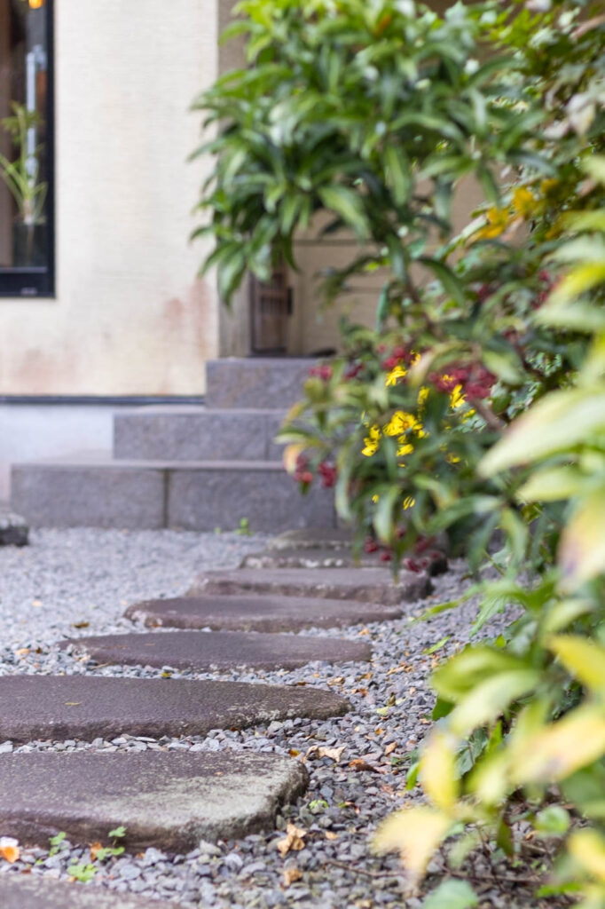 のれんのかかった門をくぐり、石の階段をのぼると現れるのは、やわらかな黄色が印象的な建物。鹿児島の水墨画家・小川景一氏が建物や内装のデザインを手がけ、光の入り方まで考えられた空間は、時間の流れがゆっくりと感じられる心地よさがあります。
