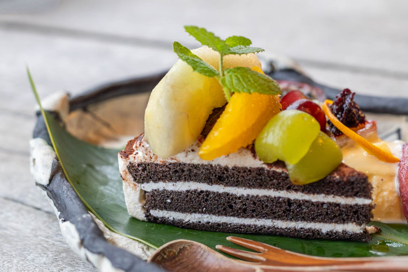 プレートには、果物とバニラアイスクリームが盛り付けられ、その量はケーキが隠れるほど。