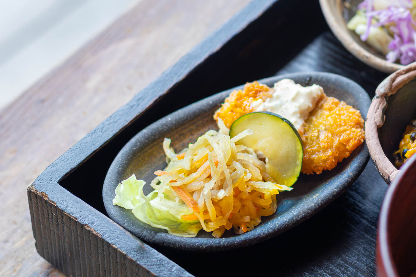 「ゴボウの卵とじご飯」は、きんぴらゴボウとニンジンを卵でとじた、甘辛い味付けのどんぶり。「カブと白菜の酢のもの」は、ムラサキキャベツやレタスの色が鮮やかで、ハヤトウリのシャキシャキ食感が楽しい一品です。中にはリンゴも入っていて、やさしい酸味が感じられます。