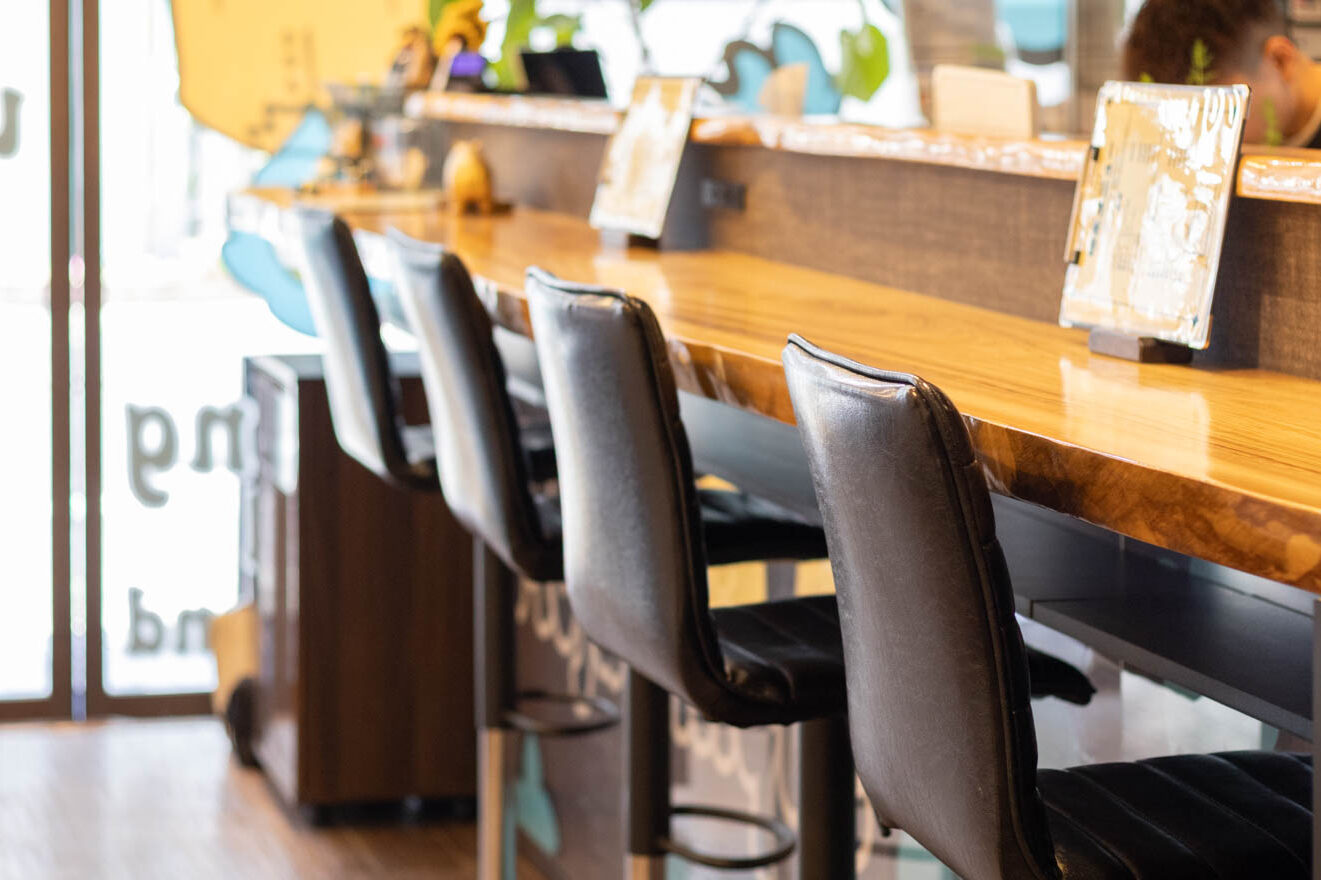 店内には、木の質感を生かしたテーブル席と、一枚板のカウンター席が並び、壁には今村さんが手がけた、色とりどりでユニークなデザインのラグが飾られています。