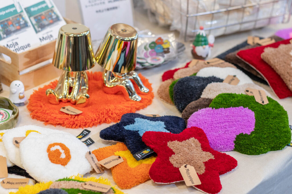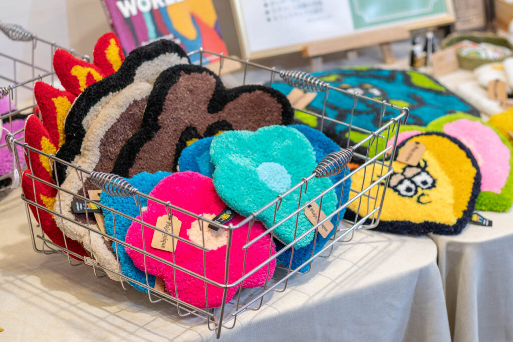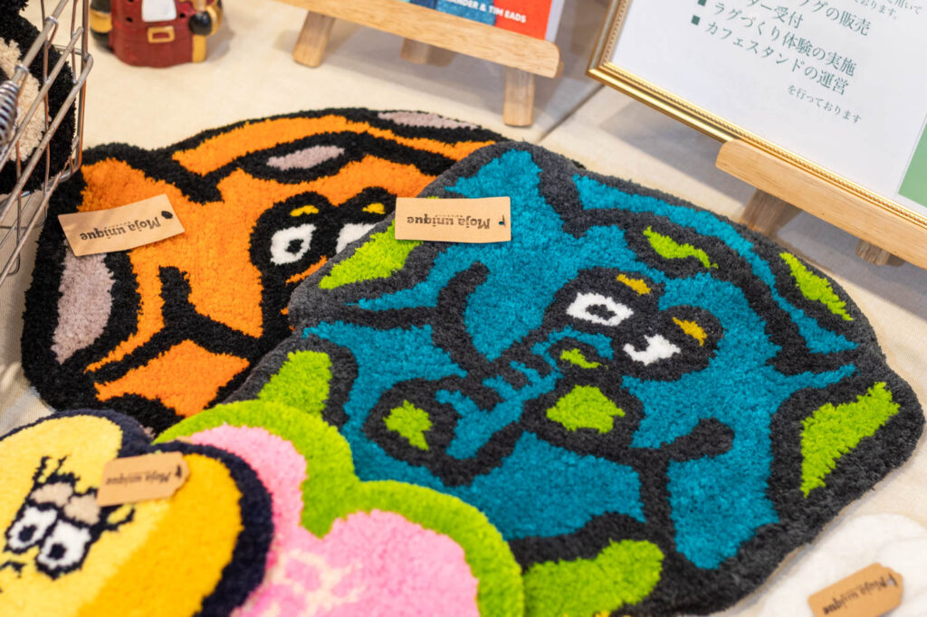店内では、今村さんが手がけたタフティングラグのアイテムの販売も行っています。ラグマットのほか、壁かけやアクセサリートレイとしても使える小さなサイズのアイテムもずらり。もこもことした質感のアイテムは、どこか愛らしさがあります。