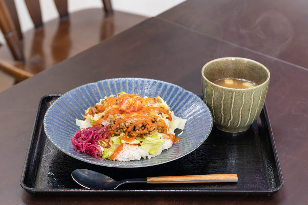 オープン当初から人気のランチメニュー「タコライス」は、コンソメスープがセットになっています。注文が入って数分経つと、チーズを炙る良い香りが店内にふわりと漂います。