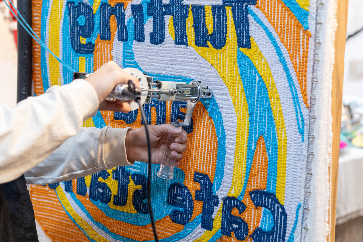「タフティングガン」と呼ばれる専用器具を使って、土台となる布に毛糸を打ち込み、自由に絵や模様を描く技法です。