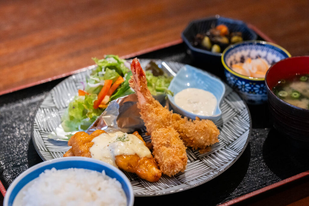 そこに合わせるのは、宮崎から取り寄せているタルタルソース。クリーミーながらもさらっとした口あたりで、あっさりとした味わいです。2つのメインが並ぶコンビ定食でも、最後までぺろりと完食でした。