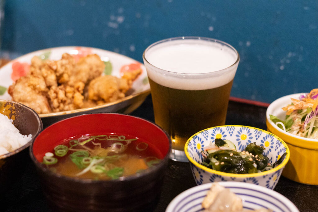 夜は、同じ定食メニューをドリンク付きで提供しています。ドリンクで、小ビールが選べるのもうれしいポイント。仕事帰りに、「軽く一杯飲みながら、しっかりごはんも食べたい」そんな声に応えたメニューです。