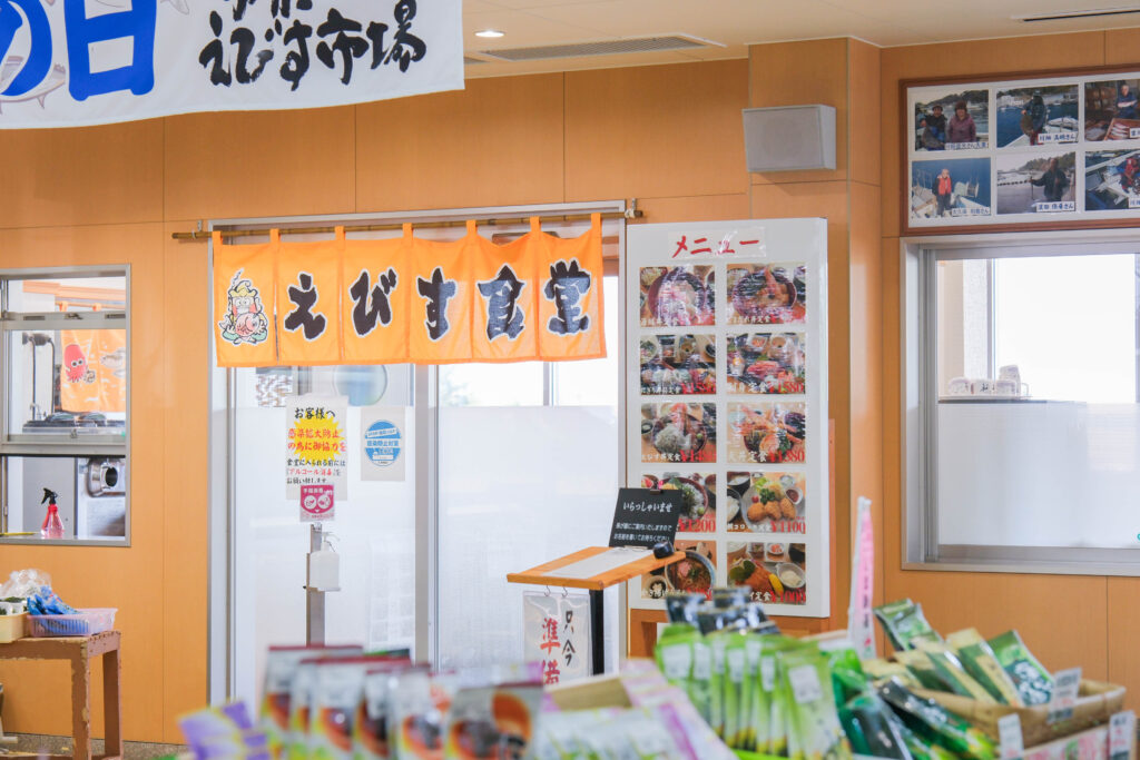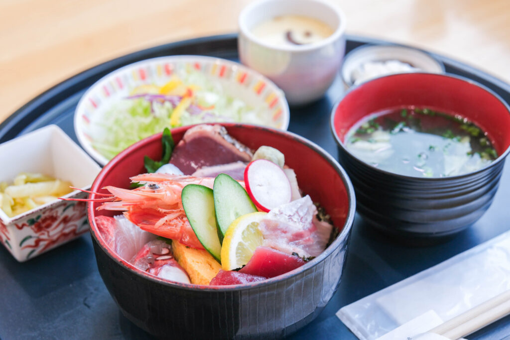 市場の中にある「えびす食堂」では、ここならではの鮮度抜群の海の幸を使った定食が味わえます。「海鮮丼定食」は、その日に水揚げされた旬の魚をぜいたくに盛り込んだ定食メニュー。脂のりの良い魚や透き通る白身など、季節ごとに変わる魚種が楽しめ、その時々の海の恵みが味わえます。ご飯は酸味控えめの優しい酢飯で、刺身との相性も抜群。定食には小鉢やサラダ、茶碗蒸し、味噌汁が付いてきますよ。