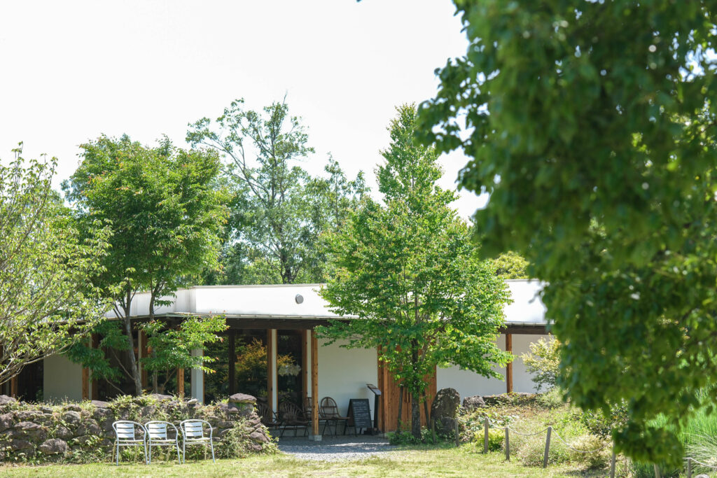 天文館から車で約25分の吉野にある「しょうぶ学園」。中に入ると空を見上げるほどの大きな木々が豊かな緑の葉をつけ、木陰を作り風に揺れています。まるで森林の中にいるような、心地よい環境が広がり、美しい緑の景色が目を楽しませてくれます。門を入ってまっすぐ行くと芝の広場が見えてきます。その右手前にあるのがパスタ&カフェ「Otafuku」です。