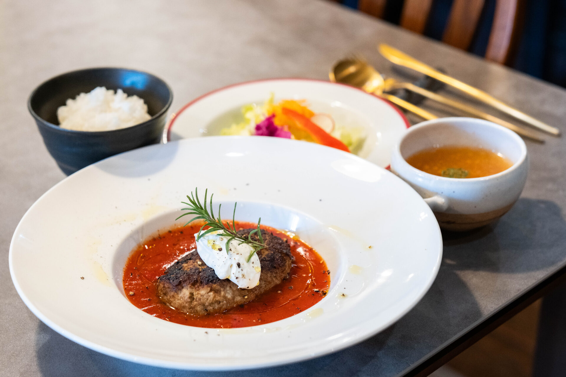 ランチは前日15時までの予約制で、鹿児島県産黒毛和牛の御膳や丼、ロールキャベツ、自家製手ごねハンバーグなどのメニューを楽しむことができます。セットに、サラダ、ライス、スープが付いてきます。