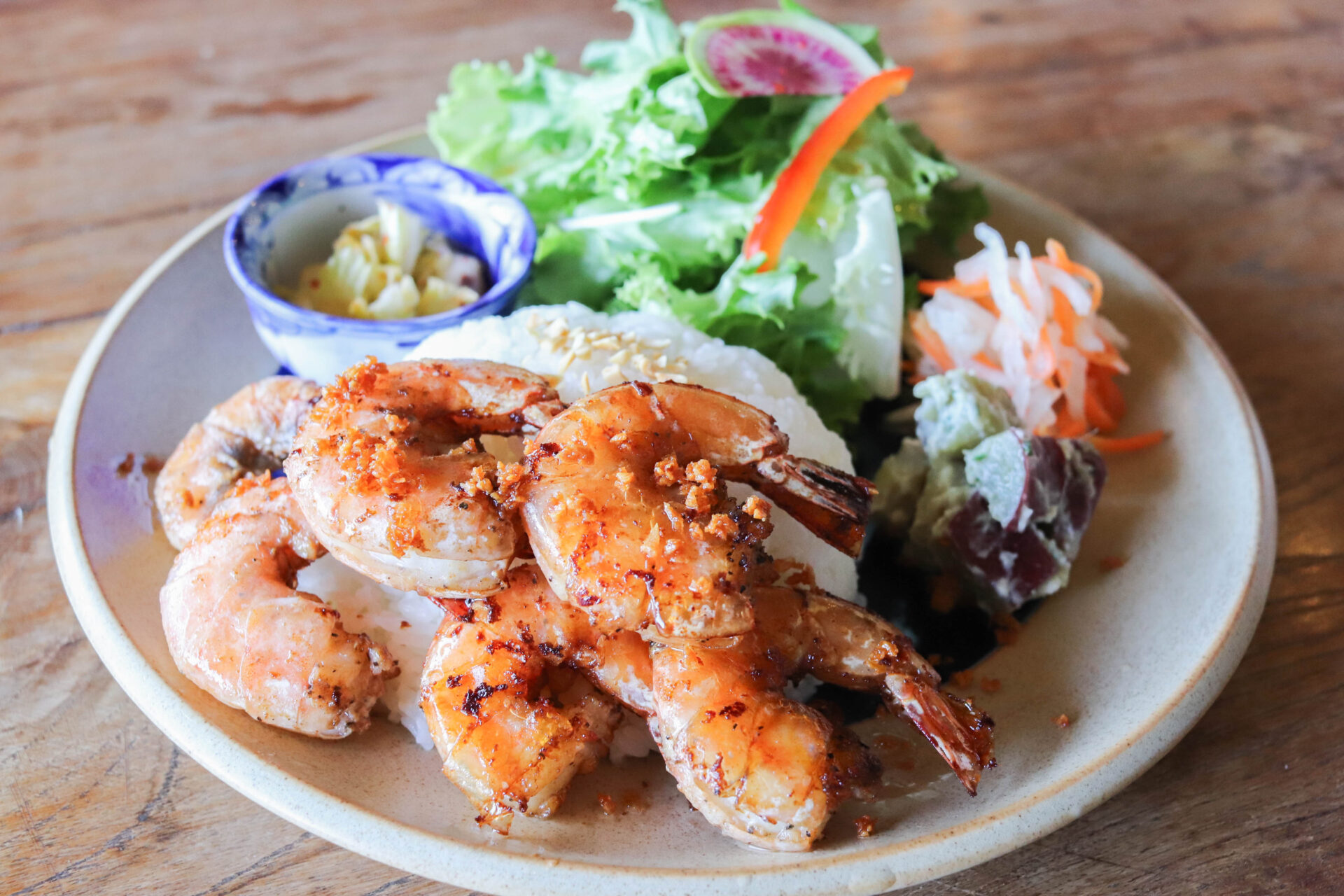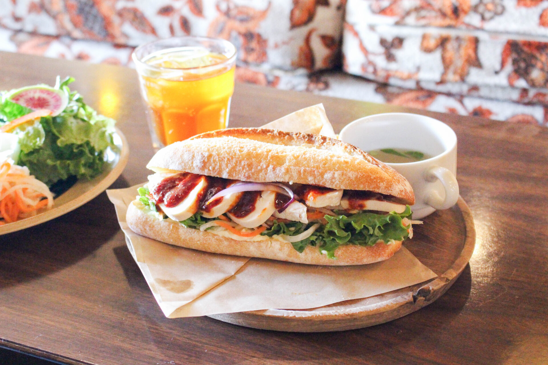 地元・鹿児島県産のオーガニック素材をできるだけ使ったアジアンフードを中心に、スイーツやドリンクを提供しています。おすすめの「エスニックガーリックシュリンプ」や、ベトナムのサンドイッチ・バインミーも人気。バインミーは、「ヤンニョムチキンのバインミー」「サバと柚子胡椒のバインミー」「ひよこ豆マリネのバインミー」の3種類から好みの味を選べます。