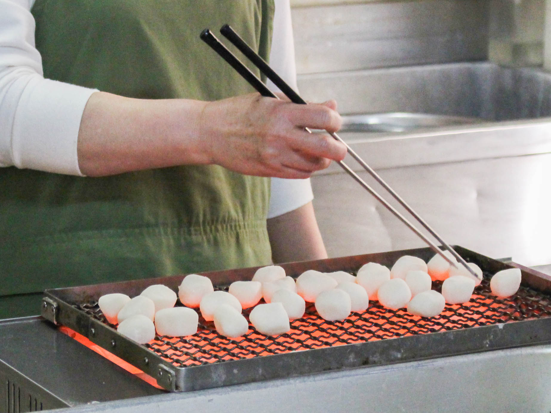 仙巌園や桜島を望む磯海水浴場がある磯地区を訪れたら食べておきたい鹿児島名物・両棒餅(ぢゃんぼもち)。明治時代から続く老舗で、地元の人々に長年愛されてきたこの店では、作り置きをせず注文ごとに餅米をついた生餅を網で丁寧に焼き上げるスタイルを守り続けています。