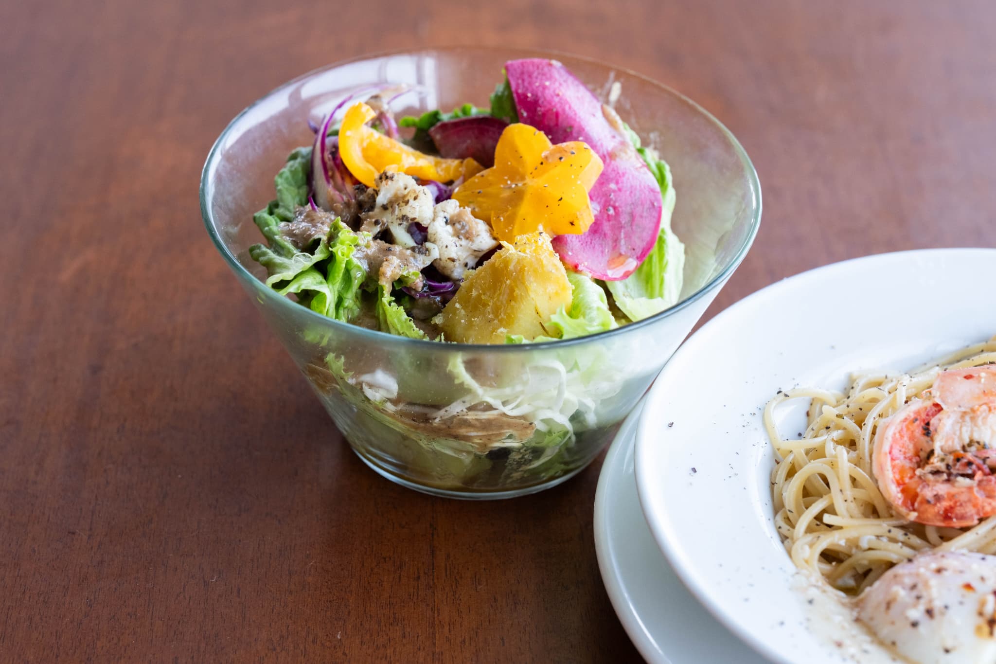 ランチセットで付いてくる「農園サラダ」は、自家農園で育てた野菜を使っています。季節に合わせてさまざまな採れたて野菜が味わえるのも楽しみのひとつです。 合わせるドレッシングもすべて手作りです。