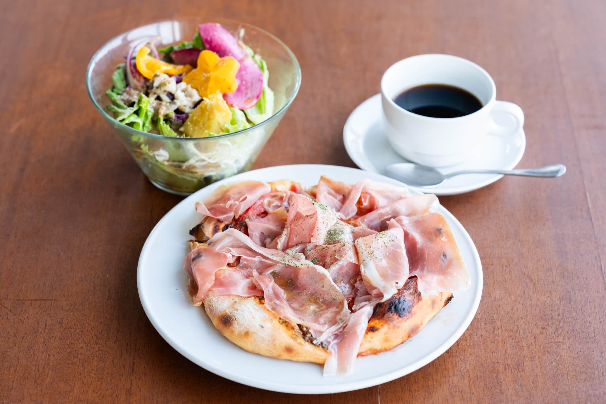 ペペロンチーノをベースにした、ここだけのオリジナルパスタ「エビのふんわりエッグとろ旨パスタ」や、生ハムの塩みと香りが生地によく馴染み、ひと口ごとに“カリ・モチ・フワ”の三拍子を楽しめる「生ハムピッツァ」などが楽しめます。
