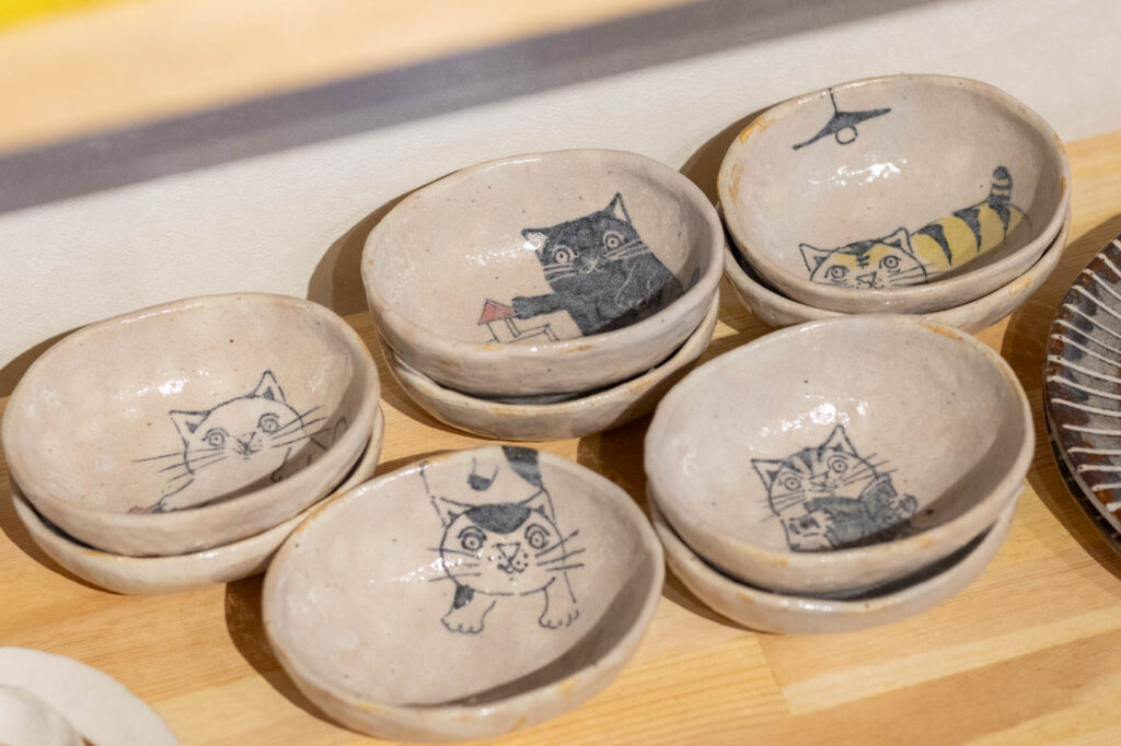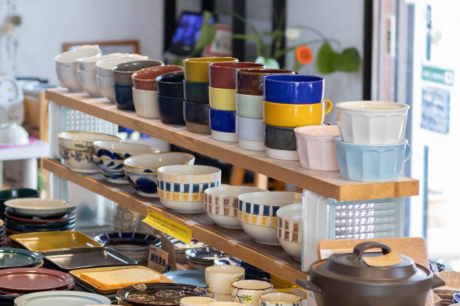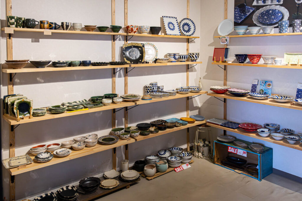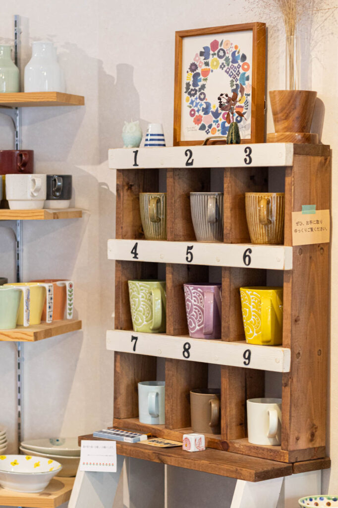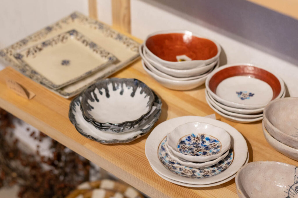 店内にある小部屋には、一点物の器がずらり。職人や作家がひとつひとつ手をかけて生み出す器は、模様や形、釉薬の表情が少しずつ異なり、手仕事ならではの温もりが宿っています。