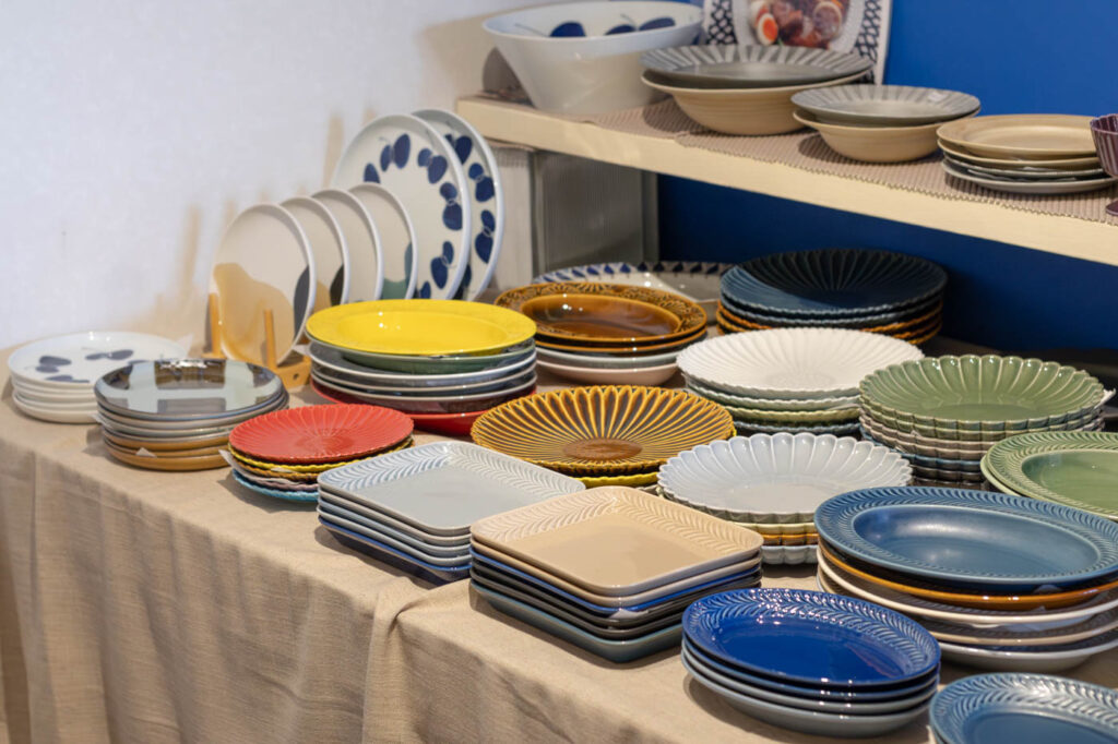 店内を歩くと、茶わん、小皿、プレート、グラス、箸置きなど、用途も産地も異なる器が次々と目に入ります。その数3,500点以上。窯元やシリーズ、用途ごとにディスプレイされているため、巡るほどに新しい発見があります。