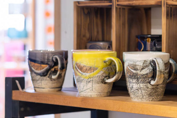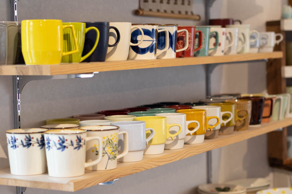 作家ものや季節感のある器も豊富。鶴琳窯(かくりんがま)の「山路マグ」は、線刻という技法で陶土に線を刻んだ美濃焼のマグカップで、デザイン性の高さから入荷後すぐ売り切れることもある人気シリーズ。