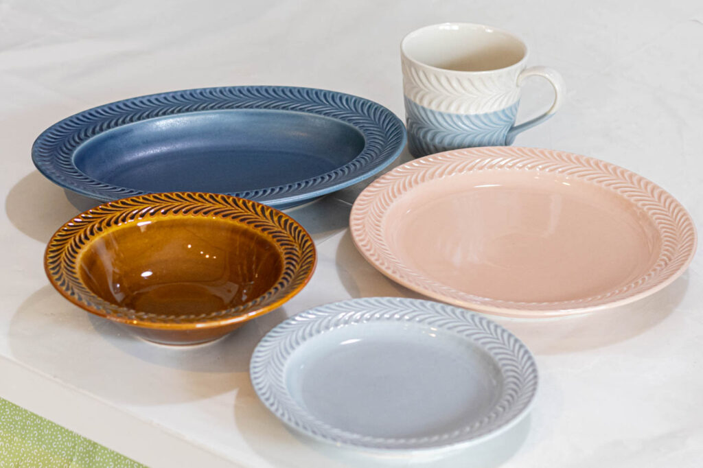 植物の力強さを表現した「ローズマリー」シリーズは、手彫りの模様と豊富なカラーバリエーションが魅力。丸皿、オーバル皿、マグカップなど形もさまざまで、ビビッドな色やパステル、マットな「デニム」と呼ばれるカラー、落ち着いた雰囲気のアメ色などが展開されています。