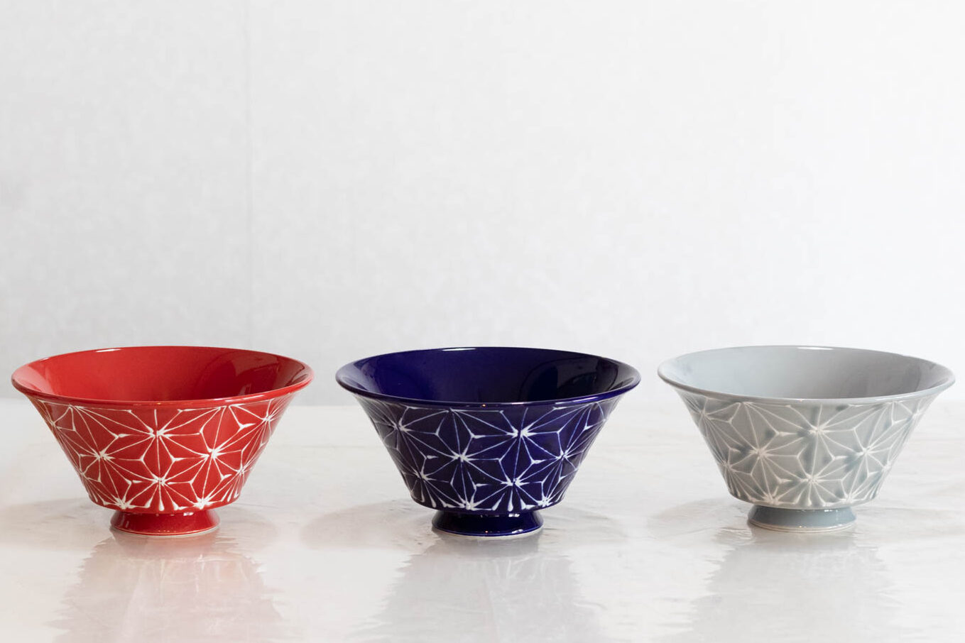 線と点を組み合わせた繊細な模様が美しい「ホワイトライン麻」シリーズ。深さと広さのあるどんぶりは、麺類や丼ものに使いやすいと評判です。そのほか、シンプルな丸皿や、350mlの缶ビールがちょうど入るビアカップなどがありました。