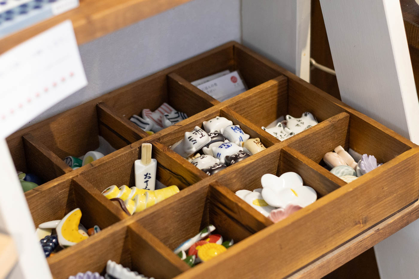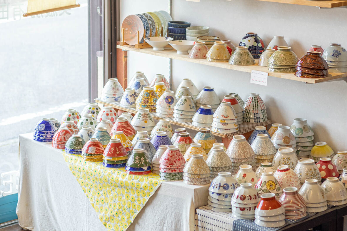 店内にある小部屋には、一点物の器がずらり。職人や作家がひとつひとつ手をかけて生み出す器は、模様や形、釉薬の表情が少しずつ異なり、手仕事ならではの温もりが宿っています。