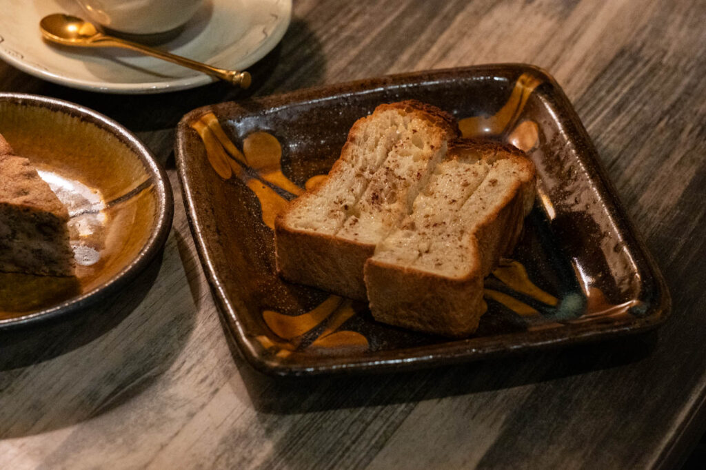「可否館」のフードメニューは、ケーキとはちみつシナモントースト。