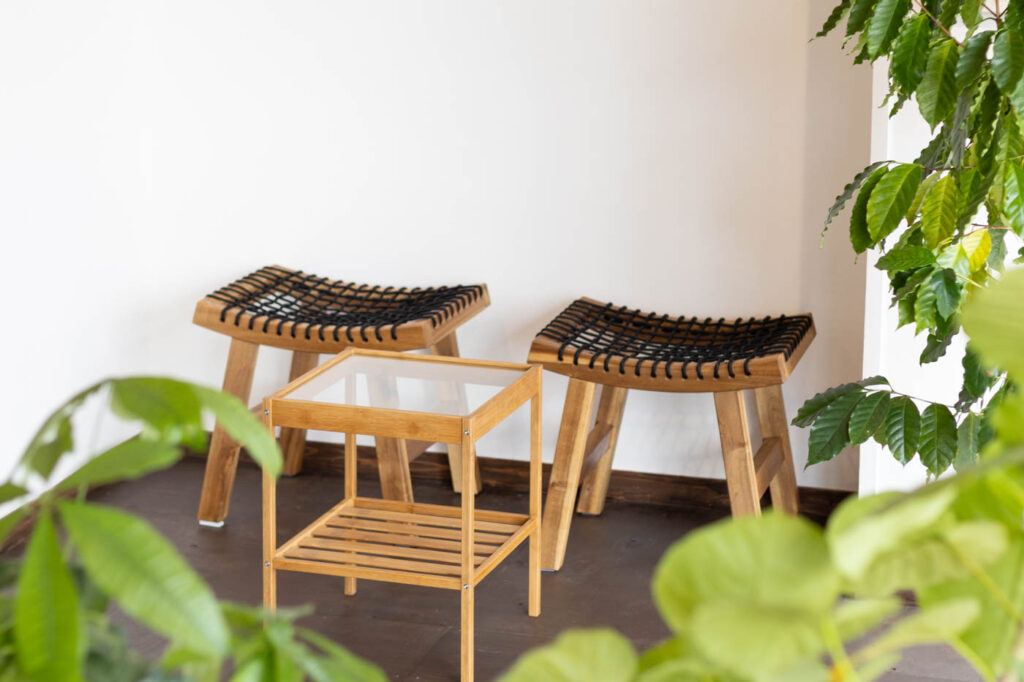 木のテーブルや観葉植物が並ぶ店内は、自然なあたたかみのある雰囲気が魅力。“お客さん同士で気軽に交流してほしい”という想いから、フロアの中央には存在感のある一枚板のスタンディングテーブルが置かれています。