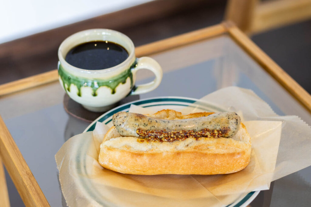 外カリッ、中ふわふわの国産小麦の天然酵母パンを使った「ホットドッグ」には、ハーブフランクとザワークラウト(キャベツの漬物)をサンドし、種入りマスタードをトッピング。ハーブフランクは、噛むと肉汁と旨みがあふれ、ザワークラウトのさっぱりした酸味とマスタードのピリッとした刺激がそこに重なります。