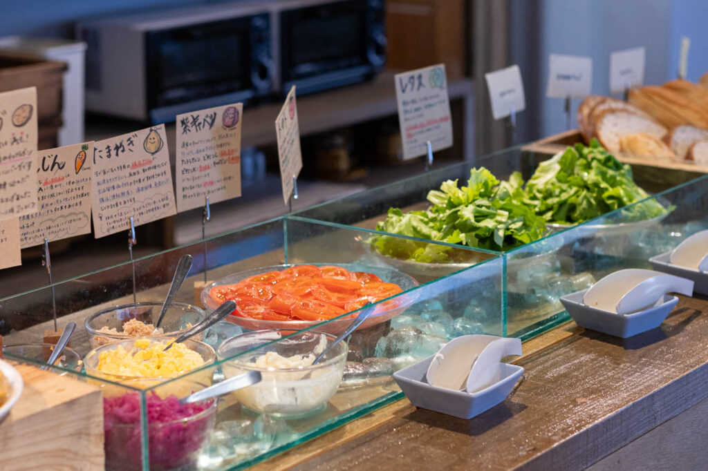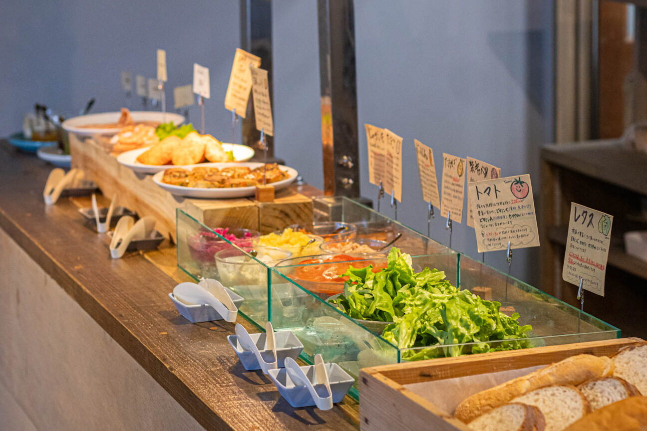 具材は、毎朝仕入れる新鮮な野菜を中心に、卵サラダ、キャロットラペ、紫キャベツのマリネなど、彩り豊かな副菜がずらり。