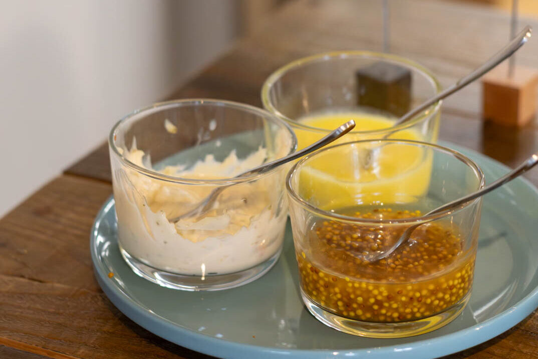 仕上げのソースは、バジルソース、マヨネーズ、トンカツソース、ハニーマスタード、ガーリックソース、タルタルソースの6種類がそろっていました。