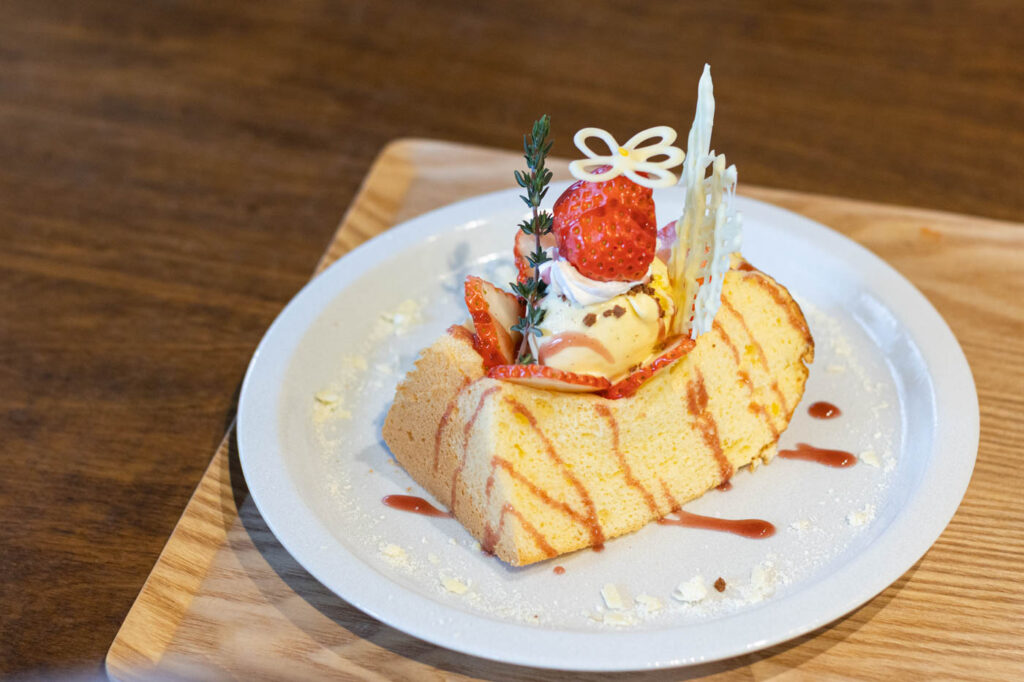シフォンケーキをパフェの器に見立て、濃厚なバニラアイスや生クリームをたっぷりと。そこに甘酸っぱいイチゴを添えれば、華やかな見た目と味わいに春らしさが感じられます。