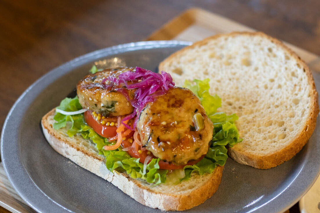 全粒粉ブレッドに野菜と豆腐ハンバーグを重ね、ハニーマスタードで仕上げたサンドイッチ。外側パリッ、内側はしっとりとした全粒粉ブレッドは、小麦の香ばしさと噛むほどに感じられる甘みが特徴です。みずみずしいレタスやトマト、柑橘の風味がきいた甘酸っぱいキャロットラペをしっかりと受け止めています。