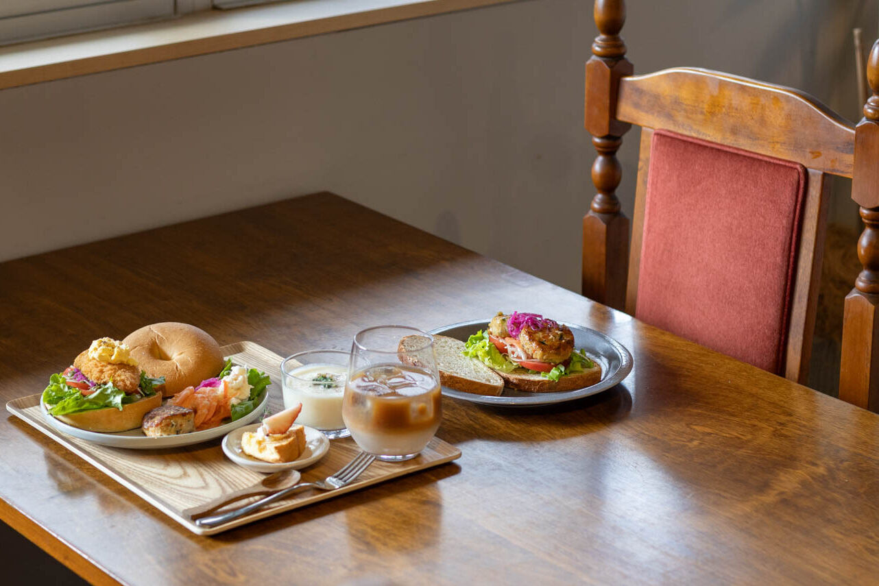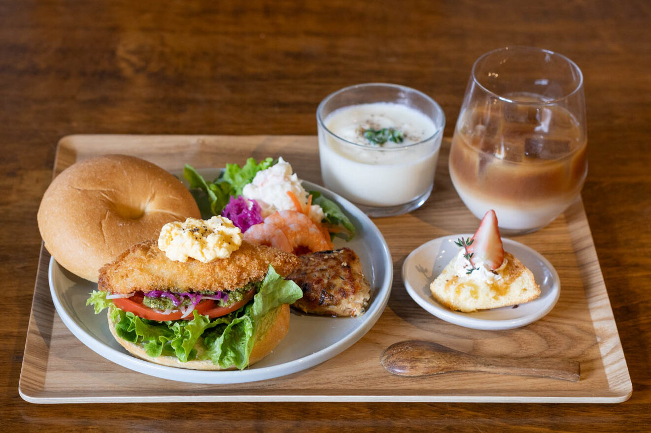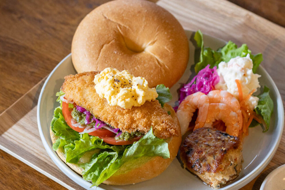 もちもちとした弾力がありながら、歯切れもよいベーグル。具材をたっぷり挟んでも生地の存在感がきちんと残り、全体をしっかりと支えます。そこに白身フライや卵サラダ、色鮮やかな野菜を重ねたサンドイッチは、見た目も華やか。