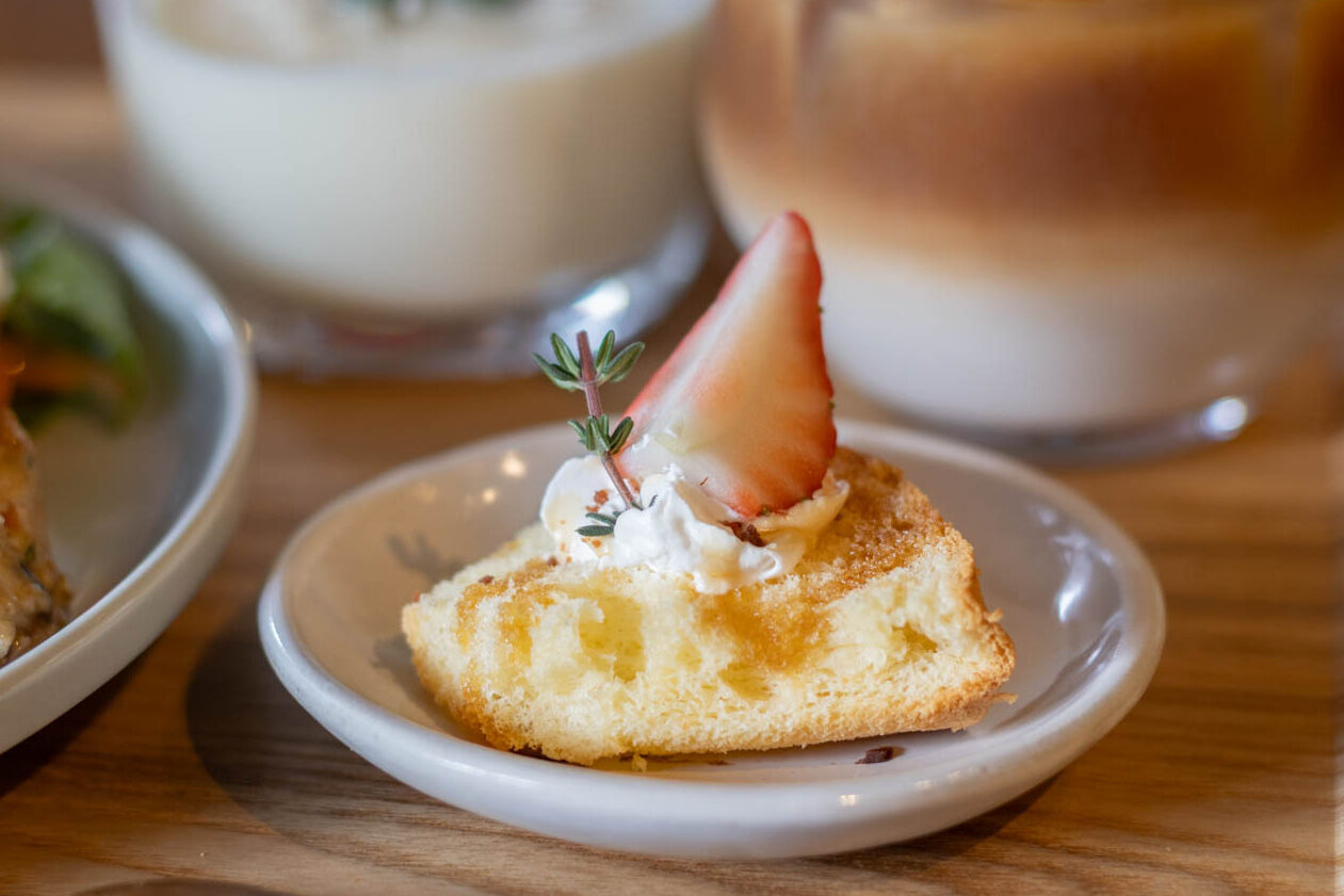 ミニスイーツは、「いちごのミニシフォン」。パティシエが焼き上げた、軽やかなプレーンシフォンに、生クリームとメープルシロップ、カットしたイチゴをトッピングしています。やさしい甘さのシフォンケーキに、甘さ控えめの生クリームと、コクのあるメープルシロップが重なり、イチゴの程よい酸味が食後をさっぱりと締めくくってくれますよ。